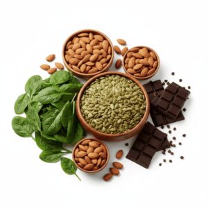 Las semillas de calabaza, las almendras, las espinacas y el chocolate negro (con alto porcentaje de cacao) son excelentes opciones.