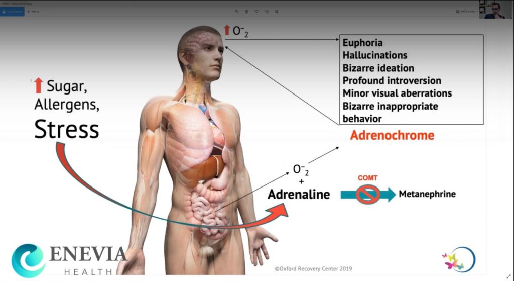 What he said next is what I found most surprising. —— He said that adrenaline (which cannot be properly metabolized due to genetic dysfunctions) is converted after some chemical processes into adrenochrome. Apparently, this substance has been shown to trigger reactions such as euphoria, hallucinations, bizarre ideas, introversion and inappropriate behavior that are common in certain types of psychiatric disorders such as schizophrenia.